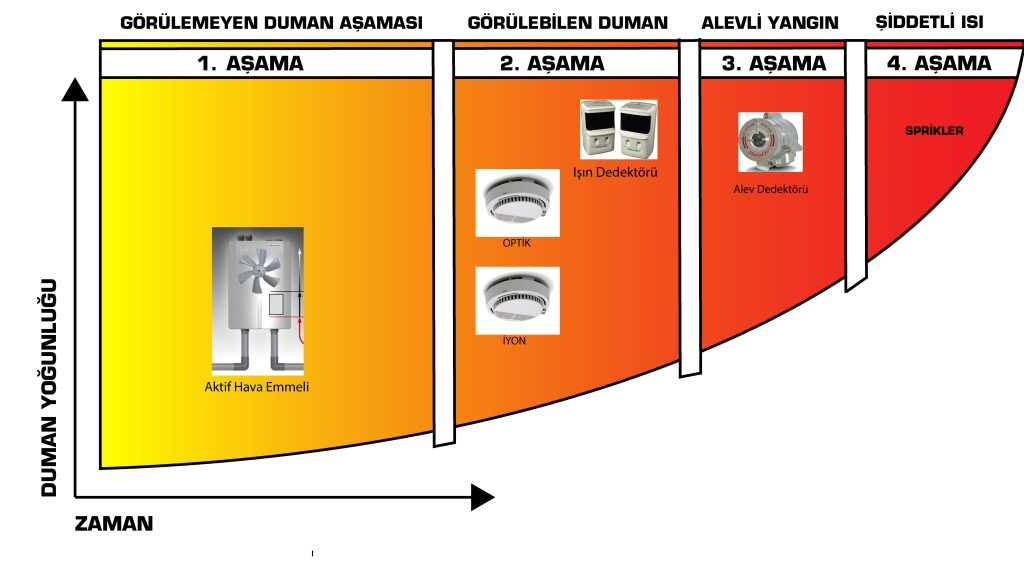 Zaman ilerledikçe İyonik algılama yapan dedektör algılıyor. Artan dumanda optik ve daha da artan dumanda Işın dedektörü algılıyor. Zaman ilerlediğinde Alev dedektörü algılıyor. Son aşamada spriklerin hissteme aşaması şiddetli ısı ile oluyor.