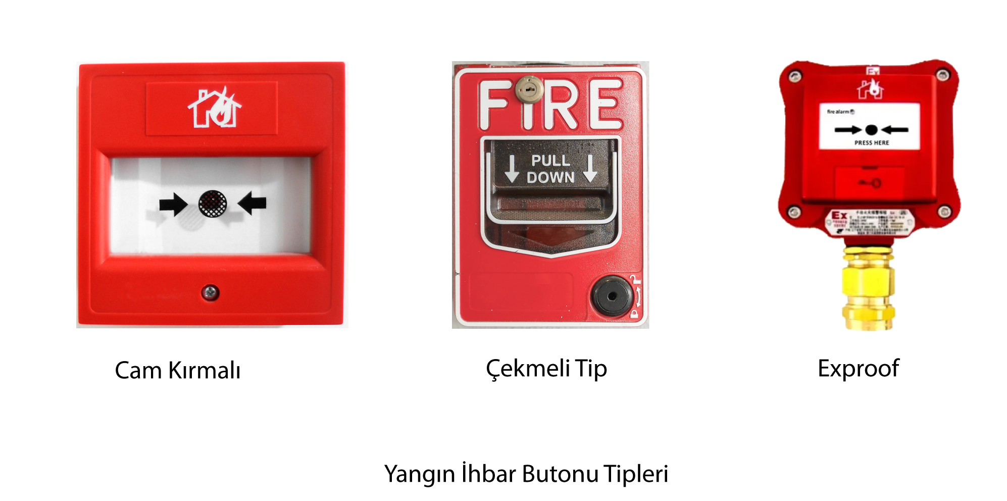 Yangın butonlarının iki tipi vardır; Cam kırma tipi ve Çekme tipidir.